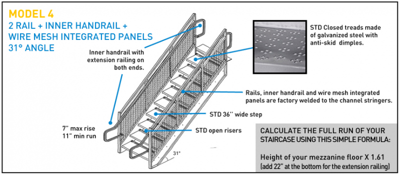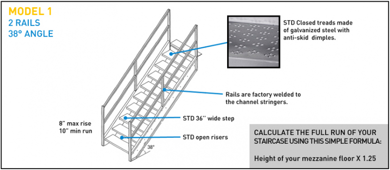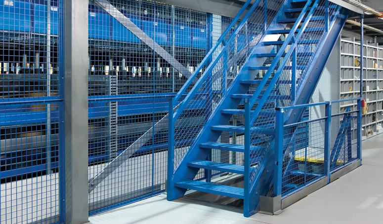 Mezzanine staircases are fully-customizable to the application of your mezzanine, space constraints of your facility and building code requirements of your region. Our mezzanine staircases are available in three standard configurations to accommodate these basic considerations – straight staircases, U-shaped staircases and L-shaped staircases. Straight staircases consist of one single stretch of stairs. Straight staircases are possible only if the clear height of the mezzanine is less than twelve feet.