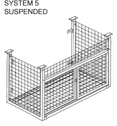 System 5 is a fully-suspended unit featuring a spacious 6’,7’ or 8’W x 4‘H x 3’D interior. All side, floor and transom panels are made of unframed 2”x2”x6&8GA electro-galvanized welded wire mesh. This innovative design allows for any necessary trimming around water pipes, wall irregularities and obstructions to be done right on-site, eliminating costly installation charges. Side frames are made of 1 1/2”x1 1/2”x16GA square tubing and come pre-welded with adjustable ceiling plates for easy adaptability on uneven surfaces. All upper and lower tracks, as well as doors are sealed with a silver powder-coated paint finish. All hanging locker systems are equipped with 2 sliding doors.