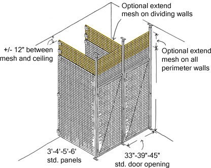 System 1 features a floor-to-ceiling post design with 7’ or 8’ high perimeter and dividing walls. Optional extend mesh reaches the ceiling and is fastened to the side, front and dividing panels. All panels and transoms are made of unframed 6GA & 8GA 2”x2” electro-galvanized welded wire mesh. This innovative design allows for any necessary trimming around water pipes, wall irregularities and obstructions to be done right on-site, eliminating costly installation charges. Posts are equipped with adjustable foot and ceiling plates for added strength on uneven surfaces.