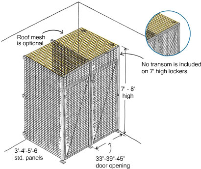 System 2 features a freestanding post design with 7’ or 8‘ high perimeter and dividing walls. All panels are made of unframed 2”x2”x6&8GA electro-galvanized welded wire mesh. This innovative design allows for any necessary trimming around water pipes, wall irregularities and obstructions to be done right on-site, eliminating costly installation charges. Heavy-duty 1 1/8“x1 1/8”x12GA structural steel transom angle included on our 7’ and 8’ high models and runs across the top of each unit, creating a superior reinforced frame. Transom mesh panels are included over the doors of our 8’ high systems only. Posts are equipped with adjustable foot plates for added stability on uneven surfaces. Roof mesh is optional and made of 2”x4”x10GA electro-galvanized welded wire mesh.
