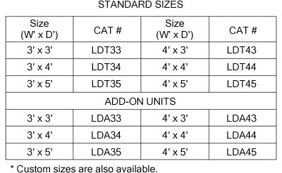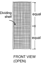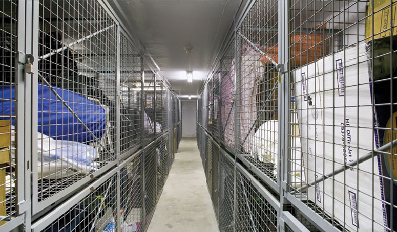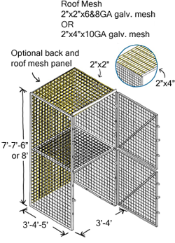 System 4 is freestanding and features 7’-6” or 8’ high perimeter walls with a dividing shelf across the middle. All side panels, doors and shelves are made from 2”x2” 10GA welded wire mesh framed in a 1 1/4“x1 1/4”x12GA structural angle with a powder-coated grey paint finish. Optional back panels and roof mesh are made from 2”x2”x6&8GA or 2”x4”x10GA electro-galvanized welded wire mesh. Transom angle is attached to the front and runs along the top of each unit, creating a superior reinforced frame. Choose from one of our standard sizes or go completely custom.